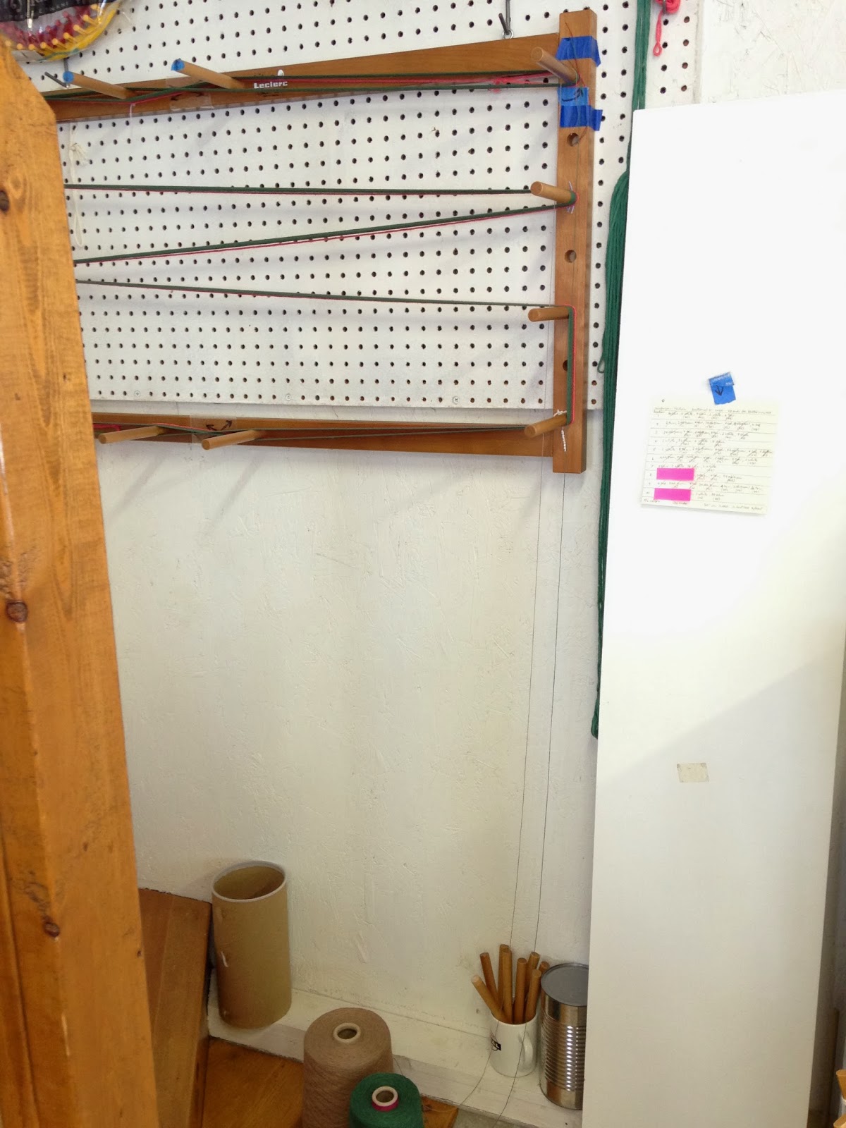 I only had one cone of each color, so I wound the colors on my warping board, one section at a time.